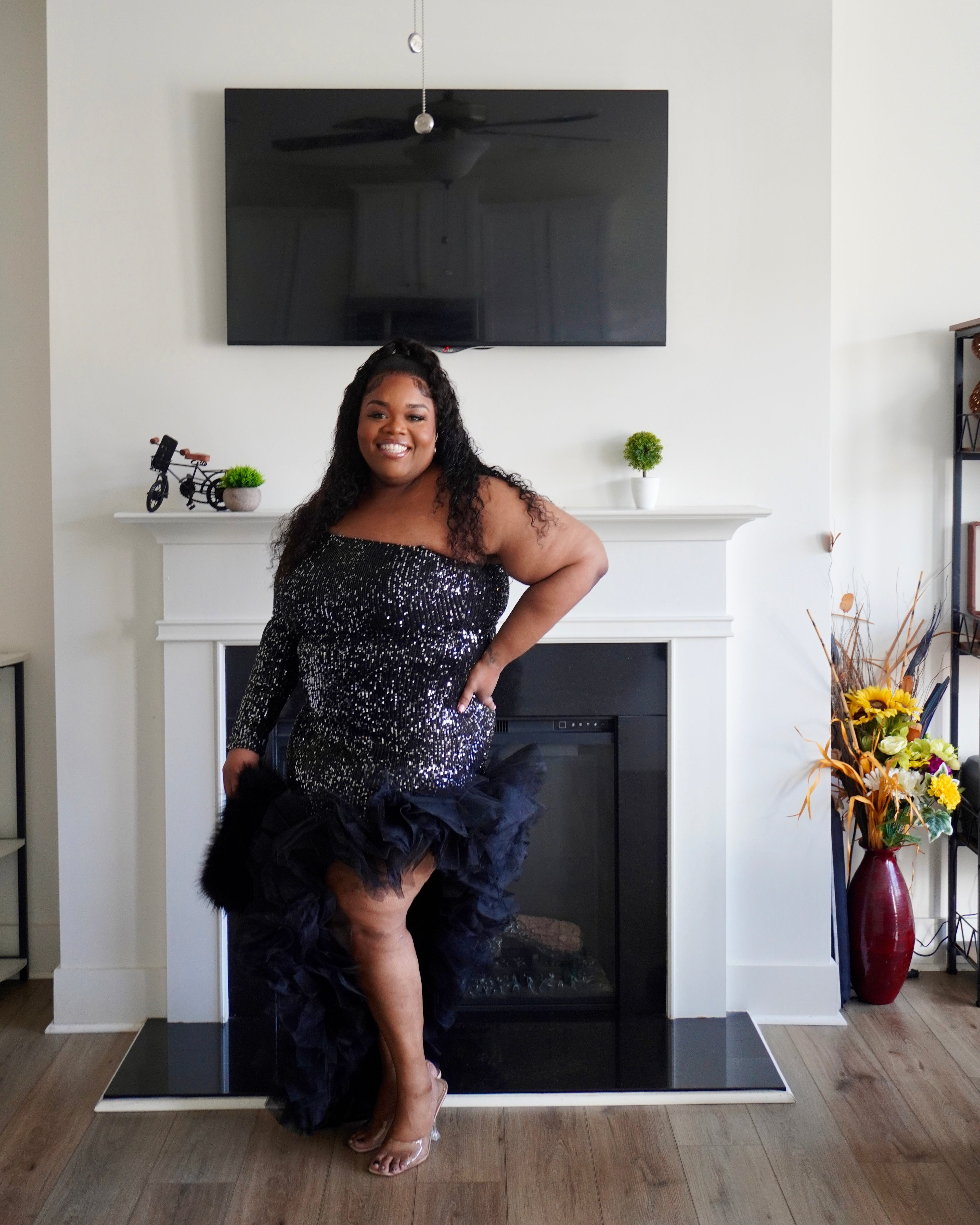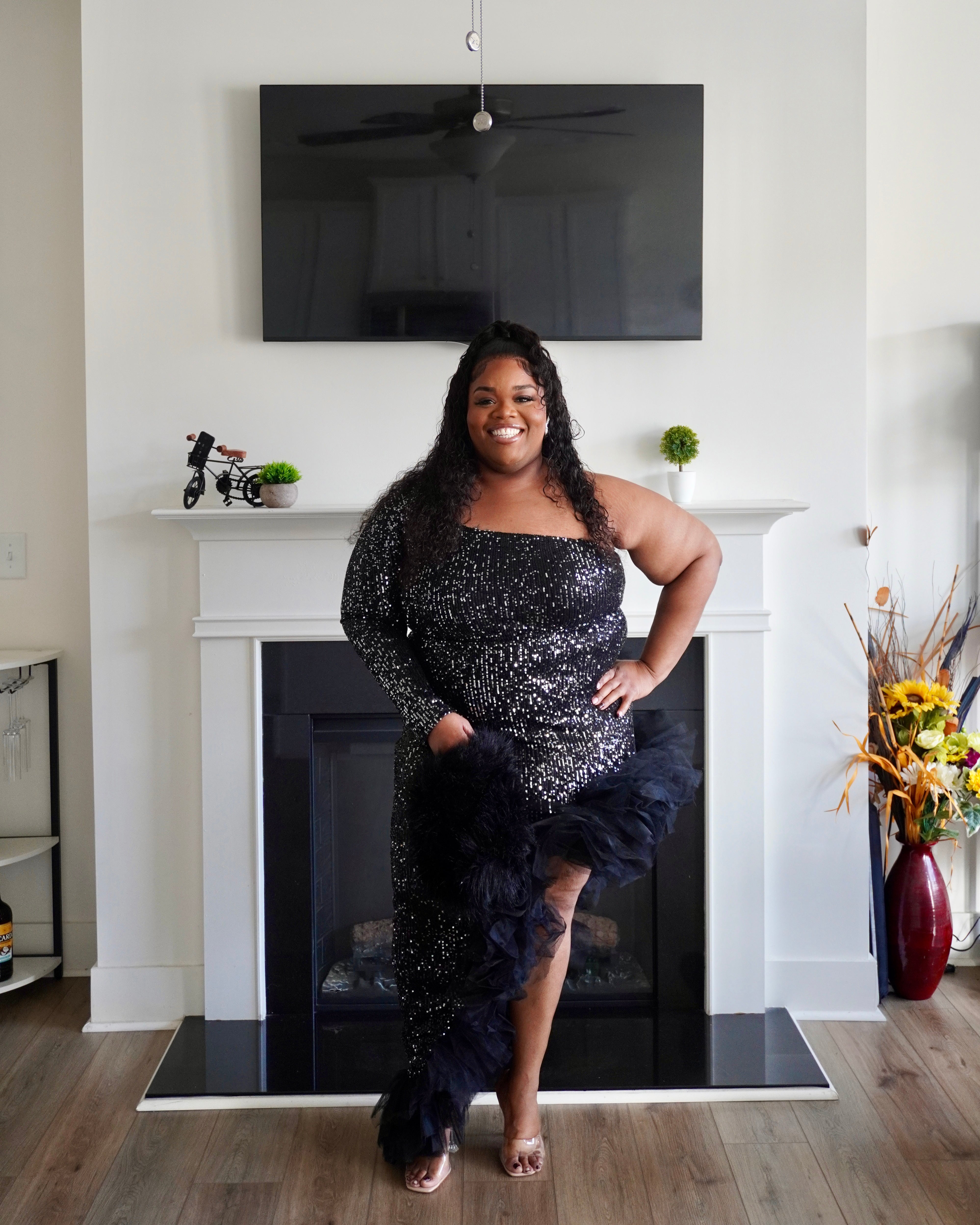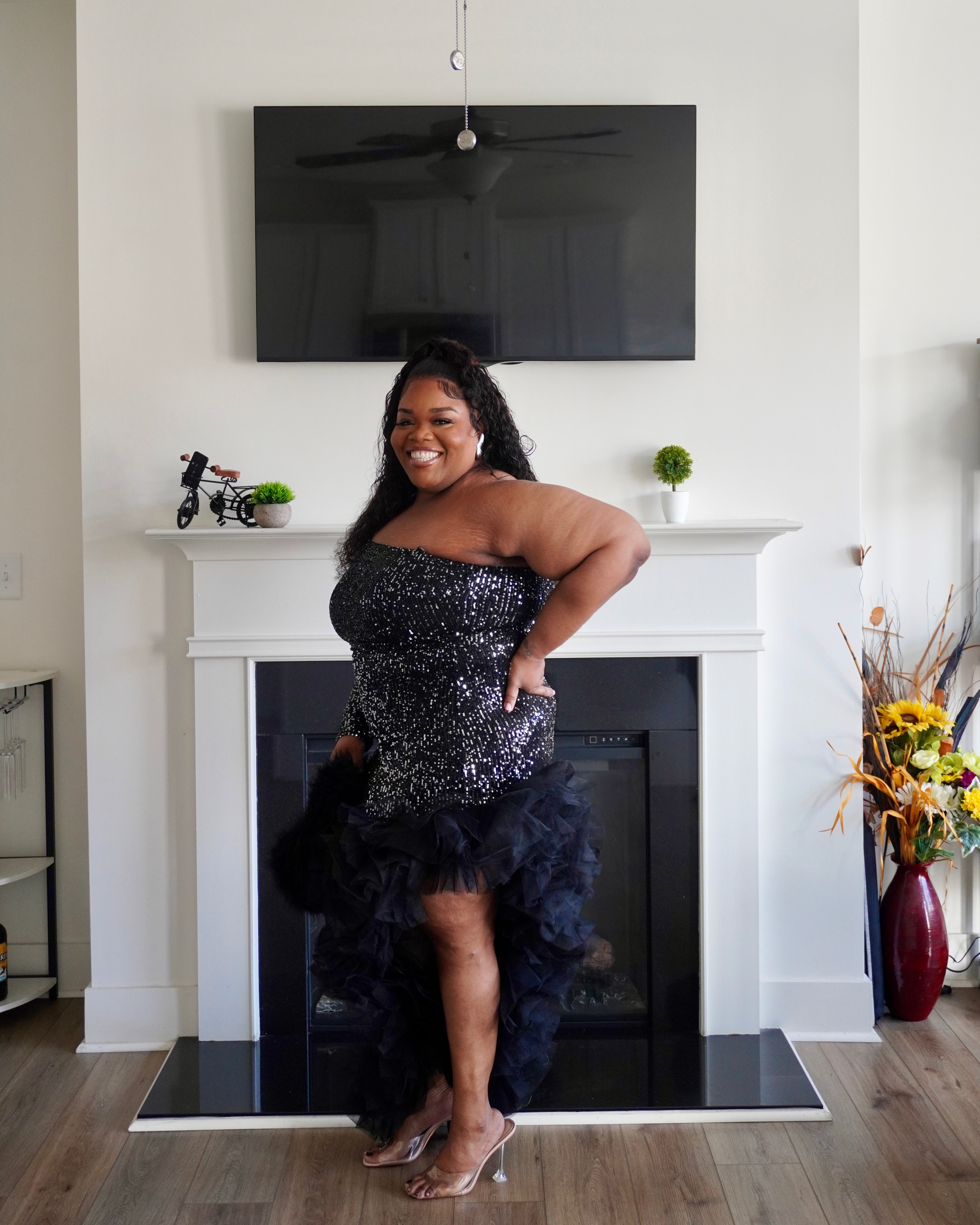 This striking black sequin dress combines dramatic flair with sophisticated elegance. The high-low hemline creates movement and visual interest, while the shimmering sequin detailing catches light beautifully for evening events or special occasions. Delicate ruffles add texture and dimension throughout, enhancing the dress's dynamic silhouette. Perfect for those seeking a statement piece that balances glamour with wearable style, this dress transitions seamlessly from cocktail parties to formal celebrations.