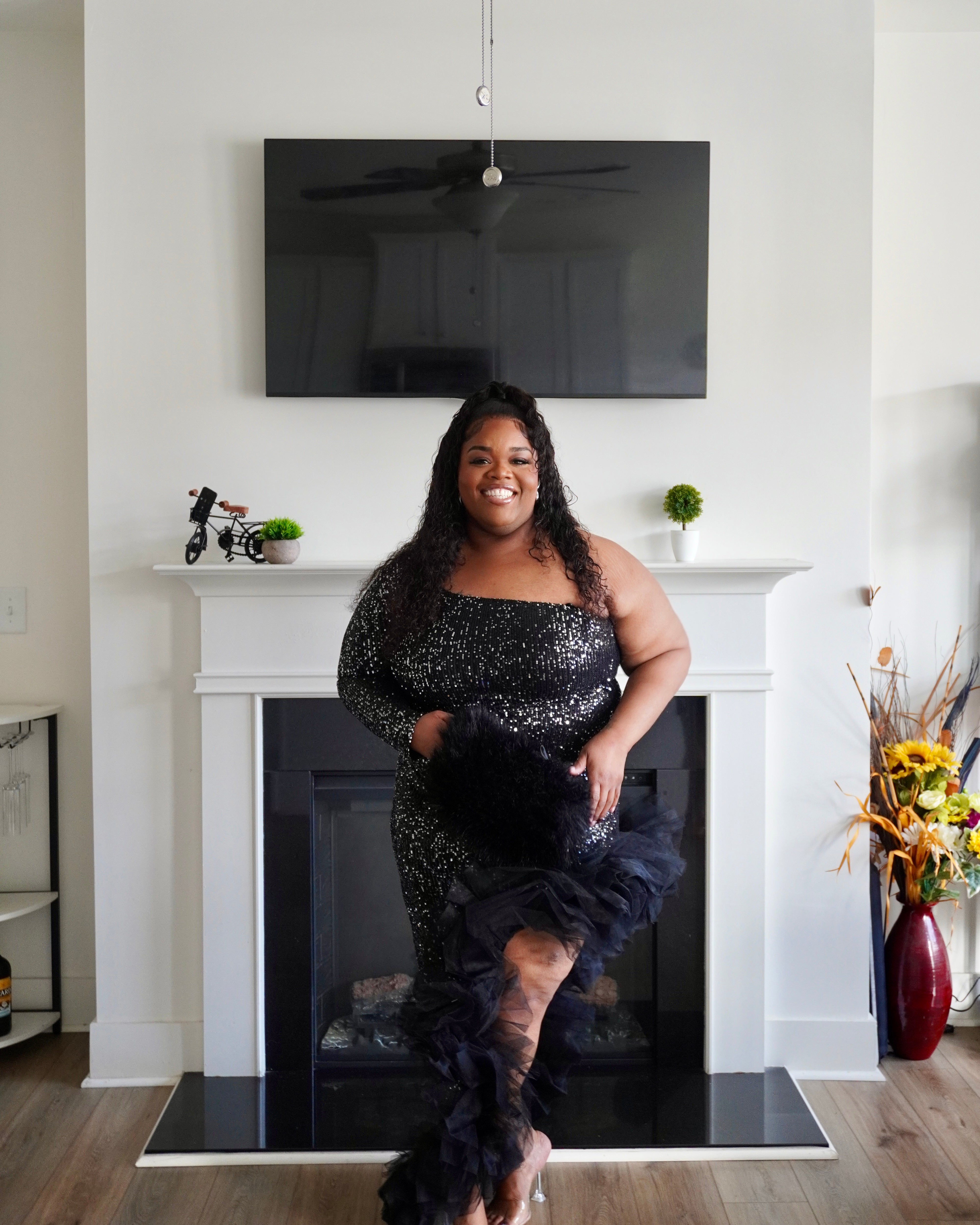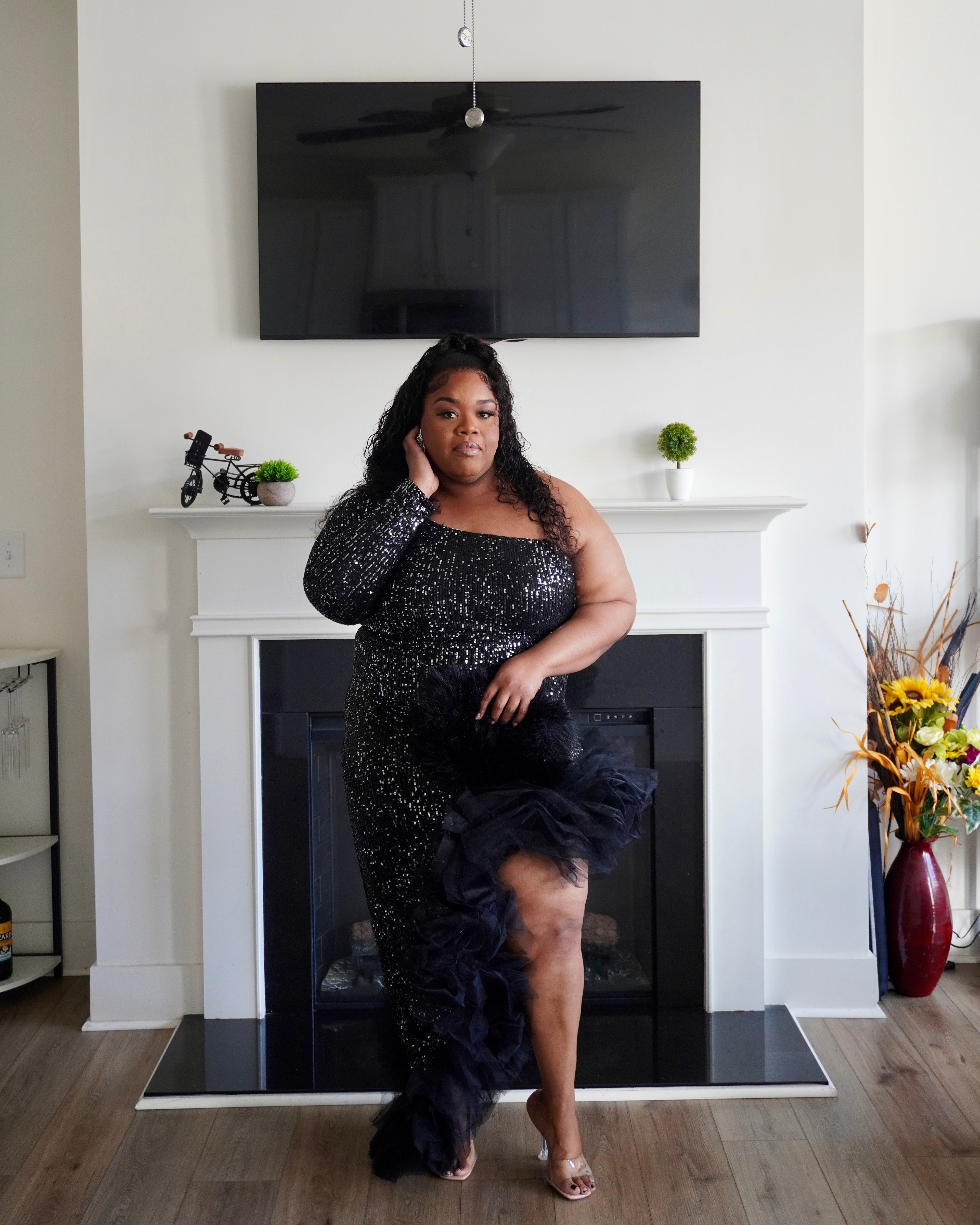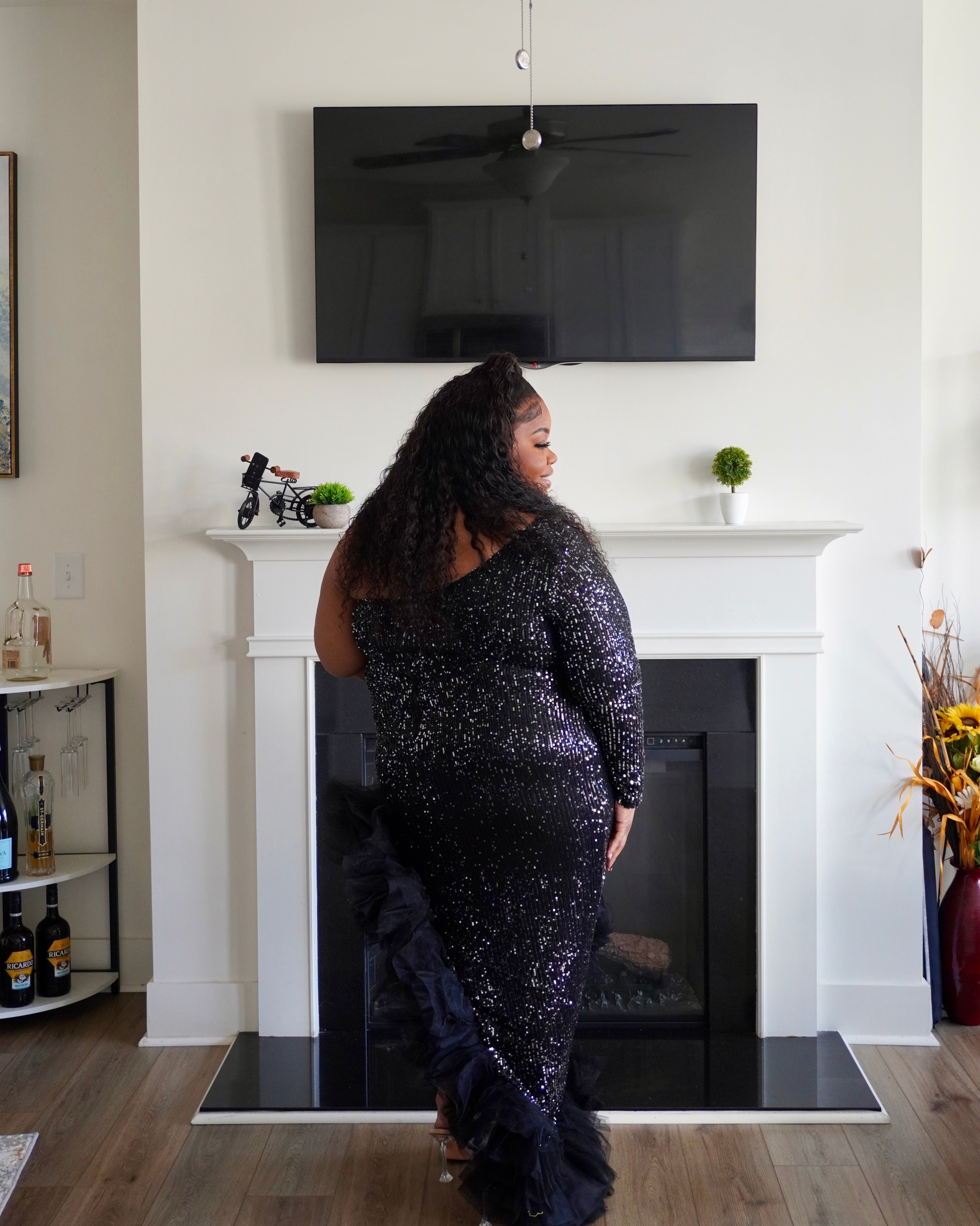 This striking black sequin dress combines dramatic flair with sophisticated elegance. The high-low hemline creates movement and visual interest, while the shimmering sequin detailing catches light beautifully for evening events or special occasions. Delicate ruffles add texture and dimension throughout, enhancing the dress's dynamic silhouette. Perfect for those seeking a statement piece that balances glamour with wearable style, this dress transitions seamlessly from cocktail parties to formal celebrations.