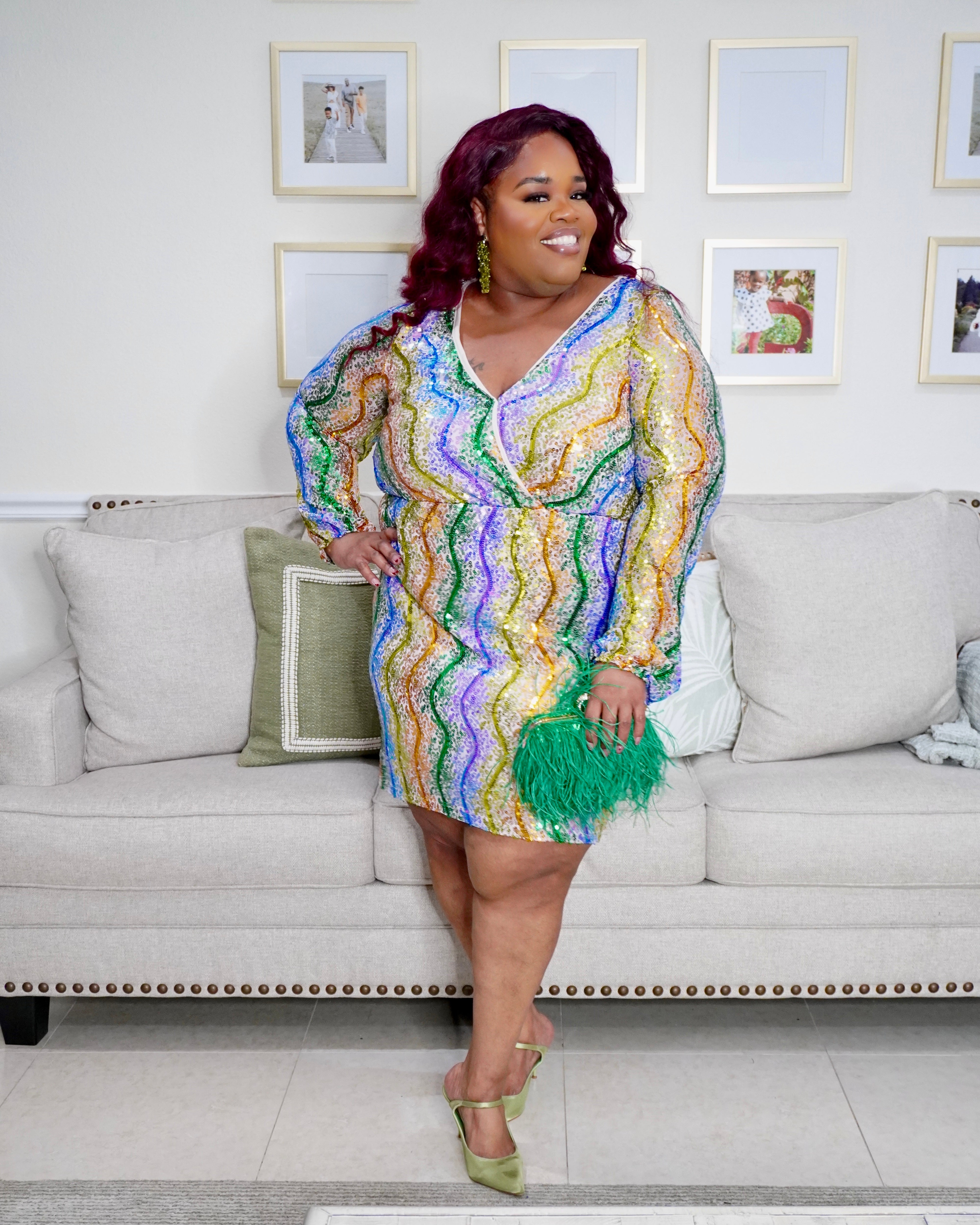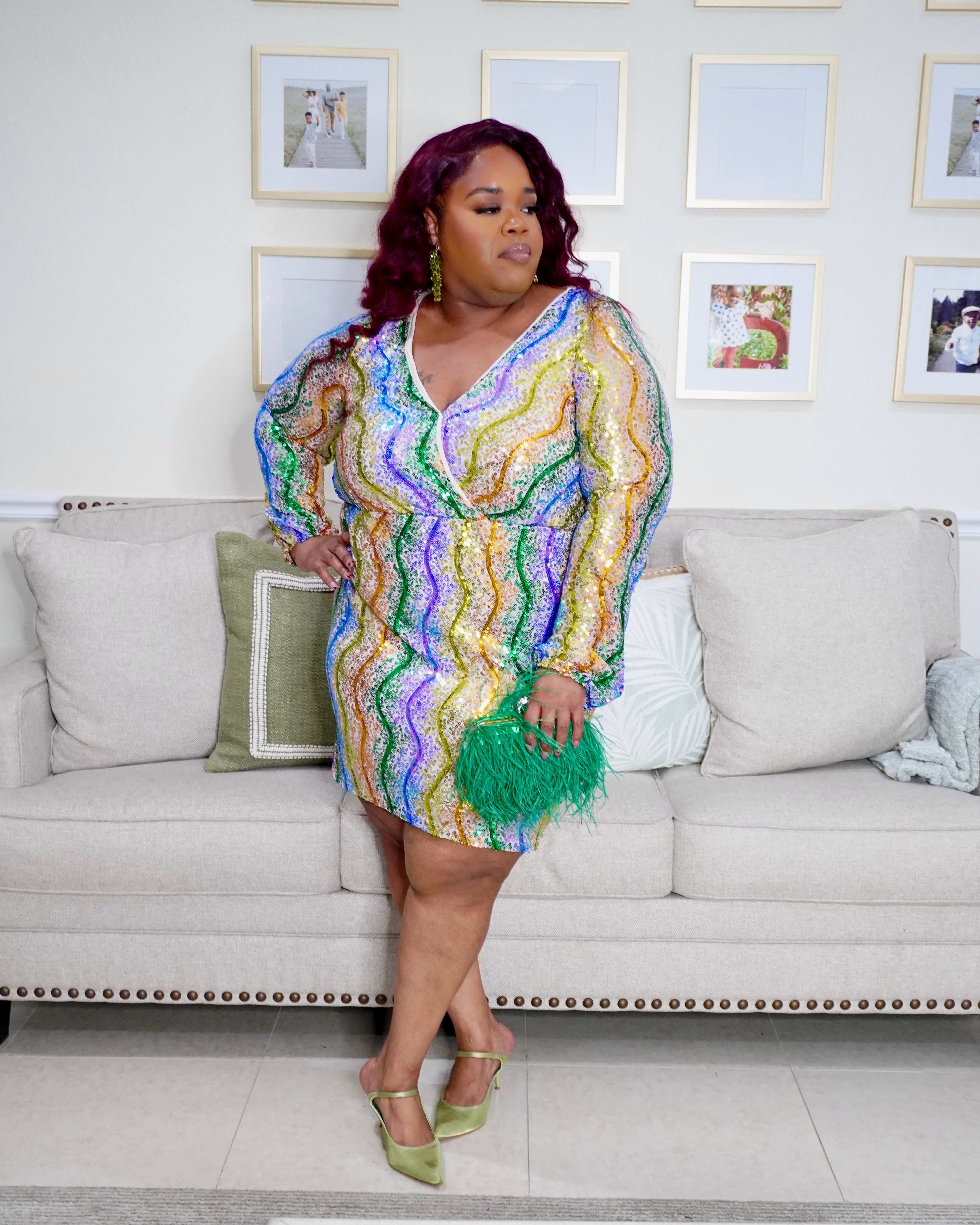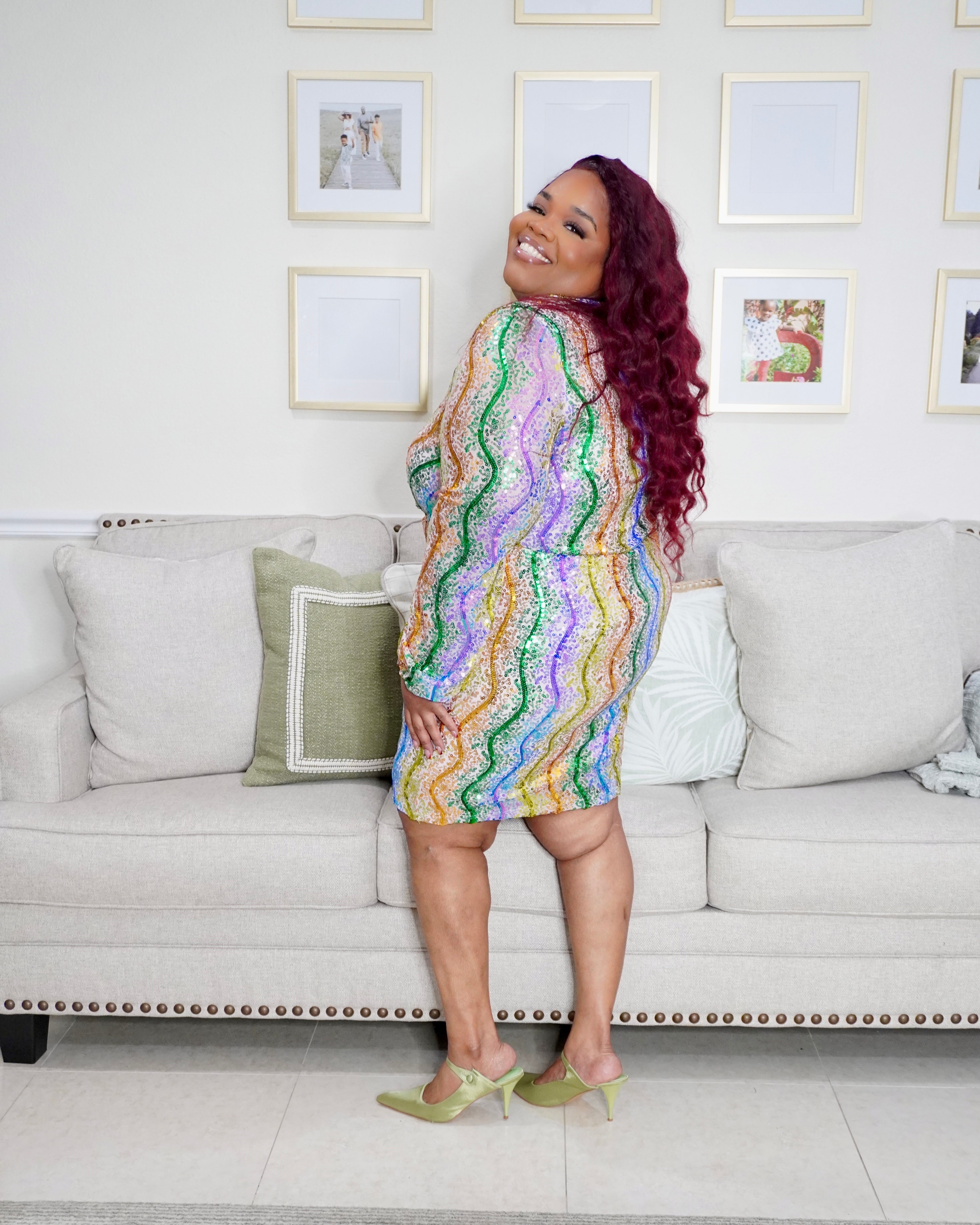 This stunning multi-color glitter dress features a flattering V-neckline and tapered waist that creates an elegant silhouette. The shimmering glitter detailing catches light beautifully, making it an ideal choice for evening events, celebrations, or nights out. The thoughtful tailoring at the waist enhances your natural curves while the V-neck adds sophistication and visual interest. Perfect for those seeking a show-stopping piece that balances glamour with refined style.