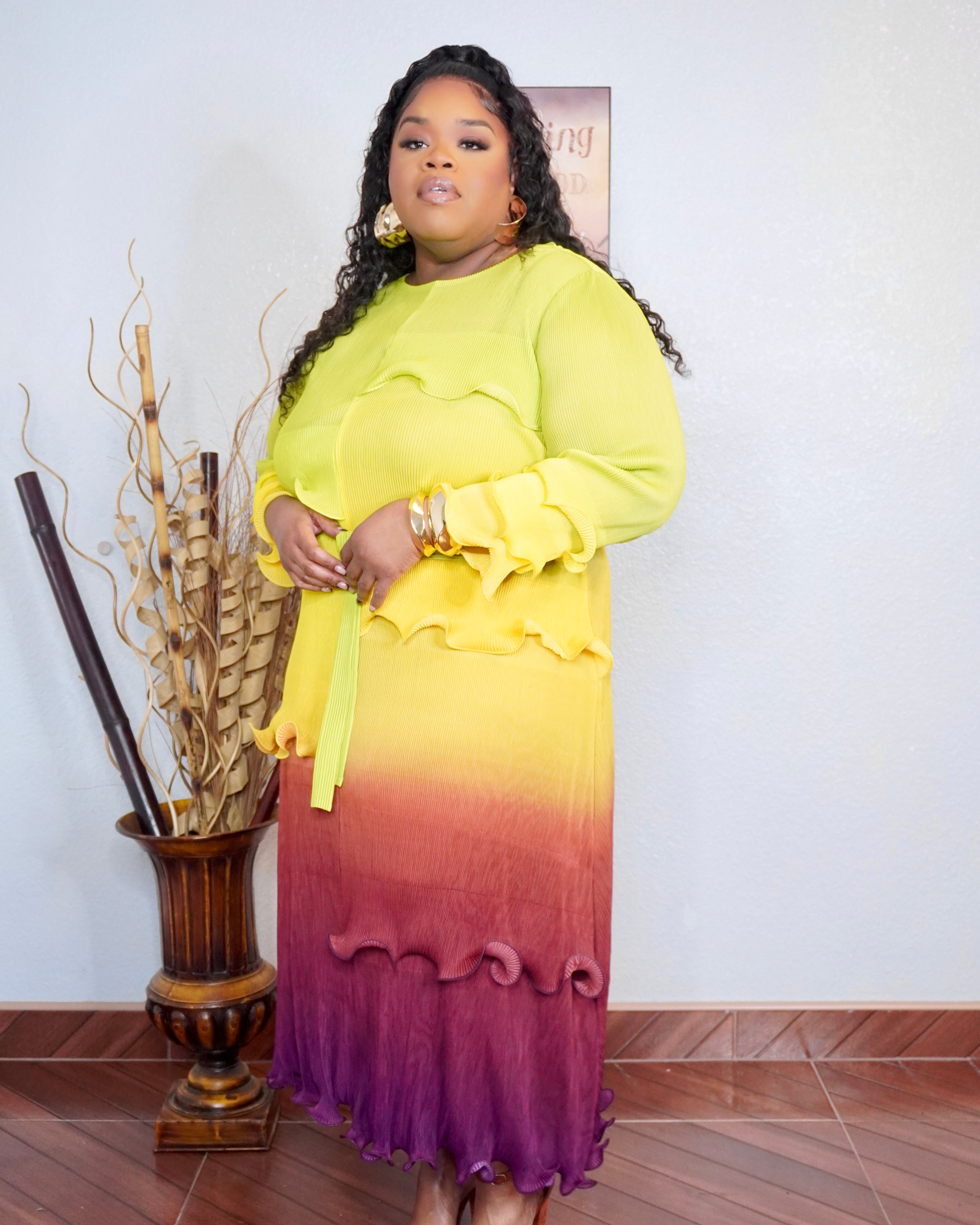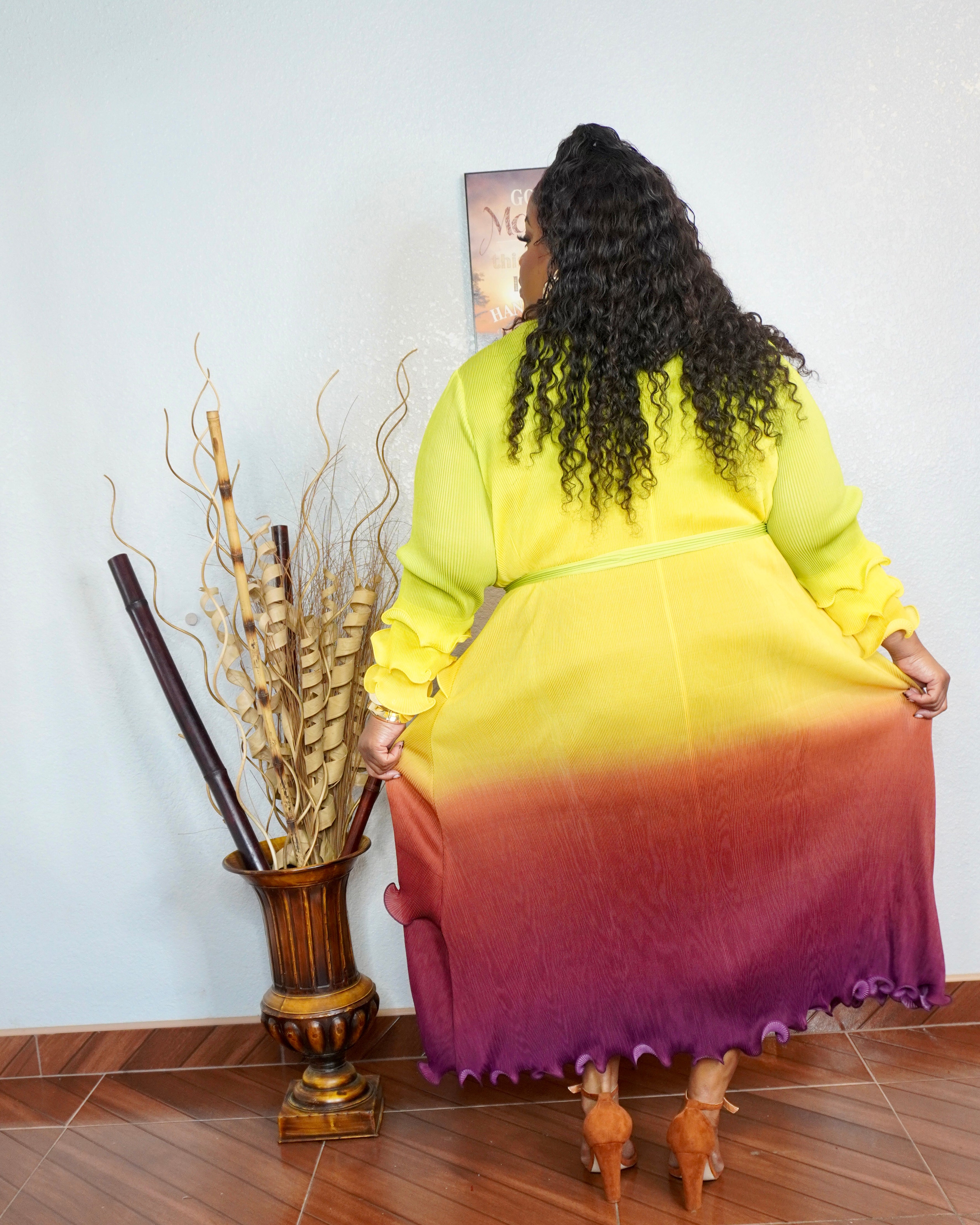 Elevate your wardrobe with this sophisticated ombré ruffle dress, where gradient color transitions meet refined tailoring. The long sleeves provide versatile coverage, while delicate ruffles add movement and visual interest throughout the silhouette. Perfect for transitional seasons, this piece transitions seamlessly from office settings to evening occasions. The ombré technique creates depth and dimension, making it a standout choice for those who appreciate subtle luxury. Crafted for comfort and style, this dress is an essential addition to any discerning wardrobe.