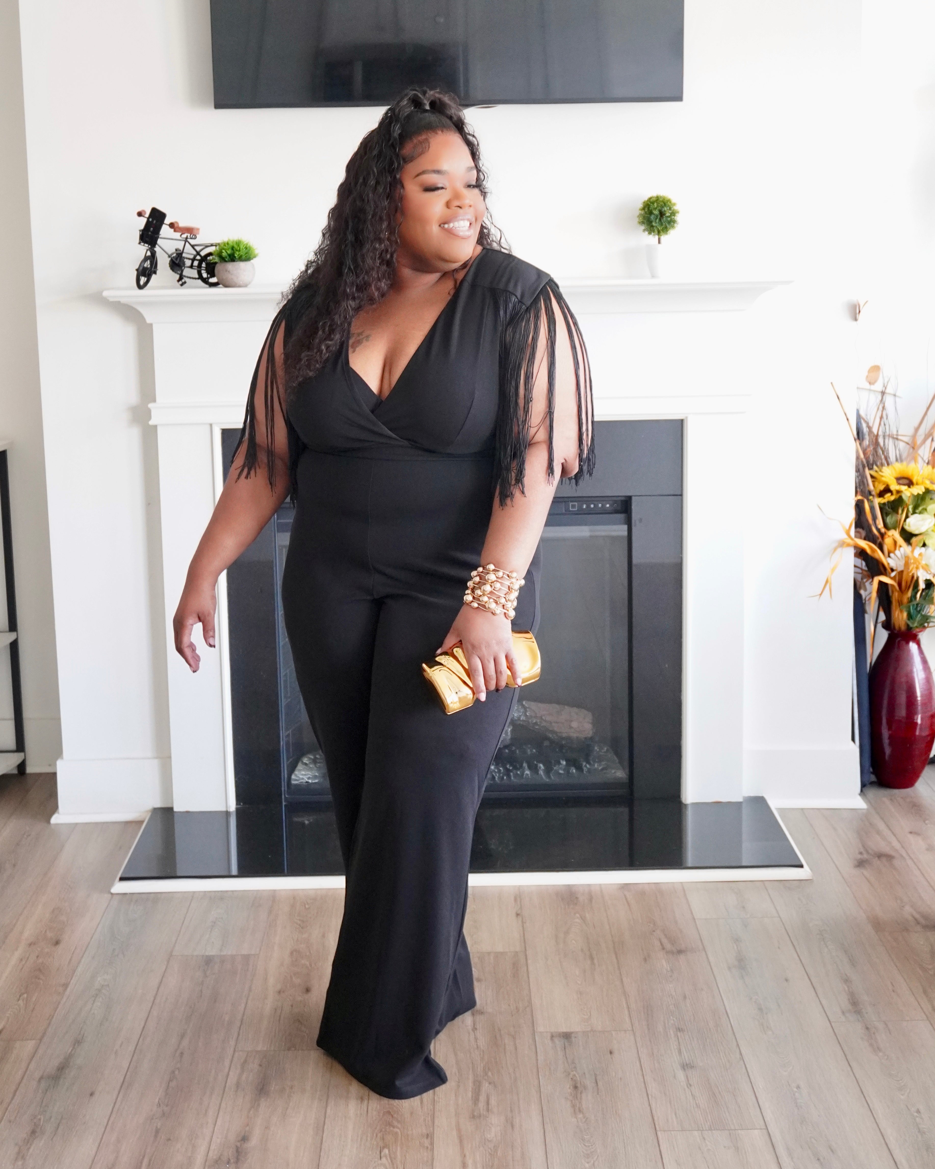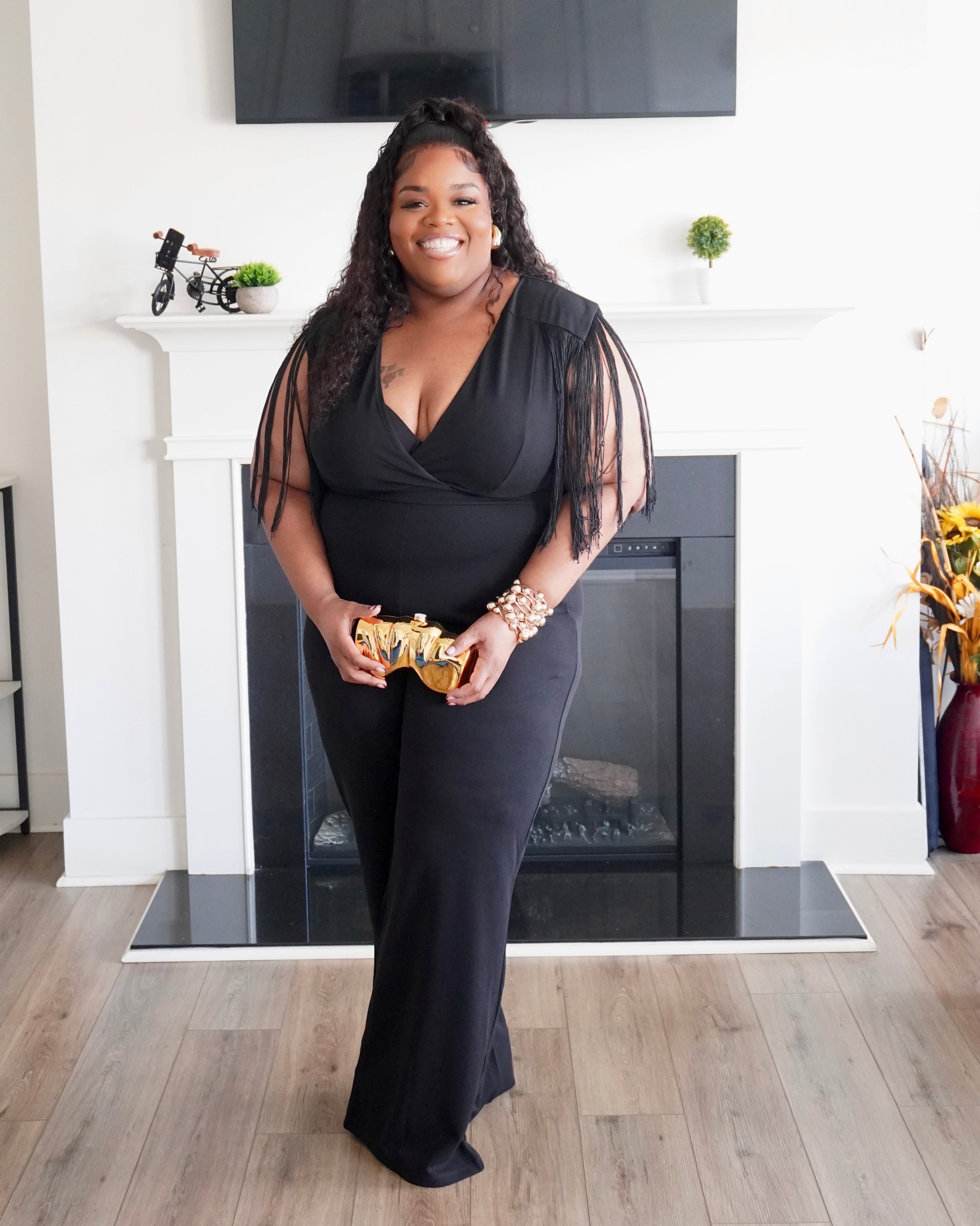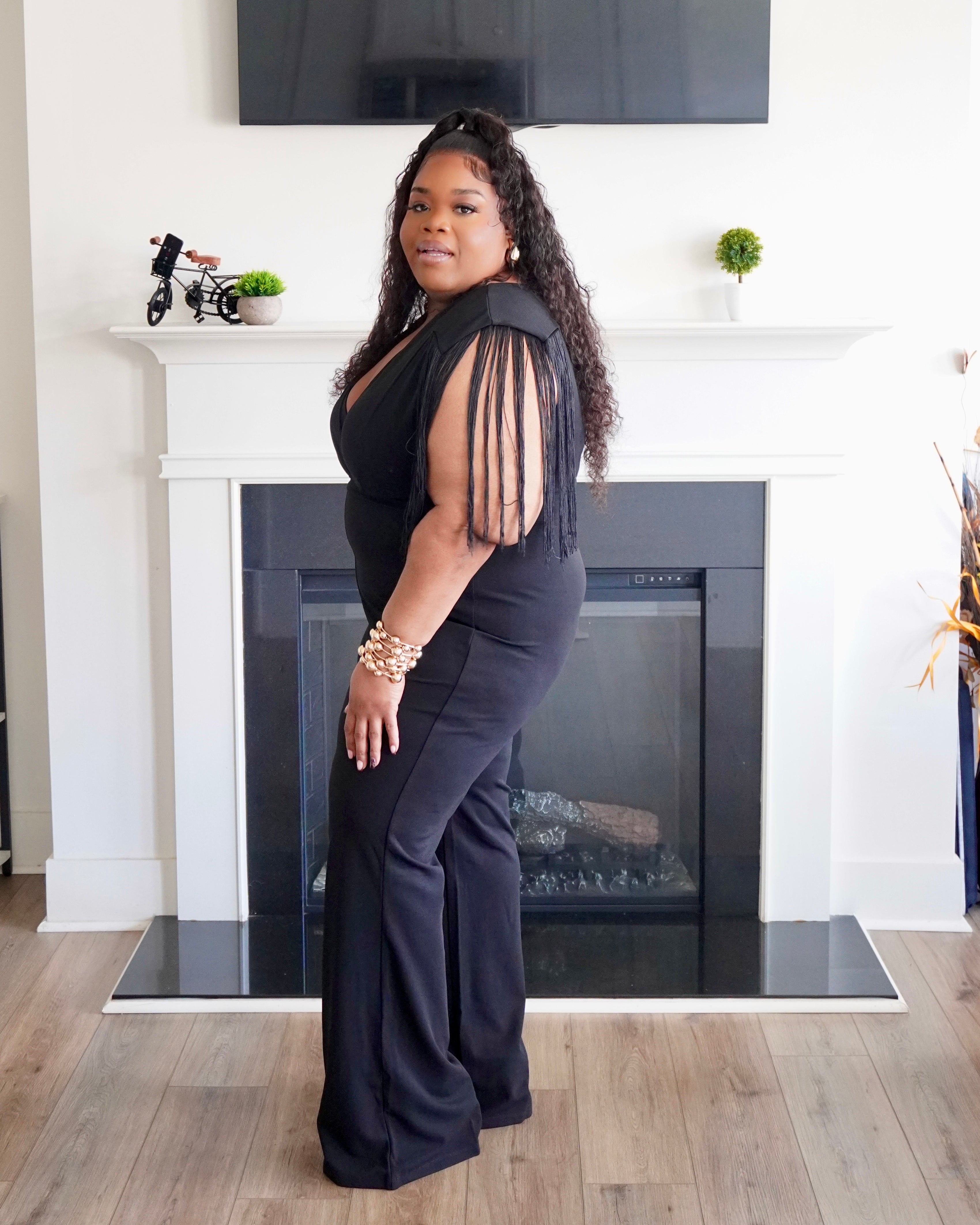Elevate your evening wardrobe with this sophisticated Black Tassles Jumpsuit, designed for the discerning wearer. The flattering V-neckline draws attention upward while the tapered waist creates a refined silhouette that skims the body gracefully. Intricate tassel detailing adds textural interest and movement, transforming a classic jumpsuit into a statement piece. Perfect for cocktail events, upscale dinners, or any occasion demanding polished elegance. This versatile one-piece offers the comfort of a jumpsuit with the impact of formal wear.